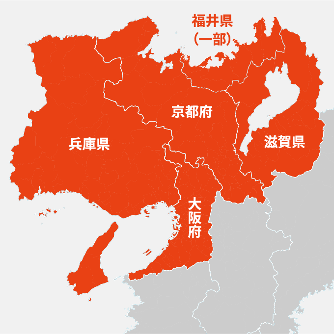 - 大阪市/堺市/能勢町/豊能町/池田市/箕面市/豊中市/茨木市/高槻市/島本町/吹田市/摂津市/枚方市/交野市/寝屋川市/守口市/門真市/四條畷市/大東市/東大阪市/八尾市/柏原市/和泉市/高石市/泉大津市/忠岡町/岸和田市/貝塚市/熊取町/泉佐野市/田尻町/泉南市/阪南市/岬町/松原市/羽曳野市/藤井寺市/太子町/河南町/千早赤阪村/富田林市/大阪狭山市/河内長野市